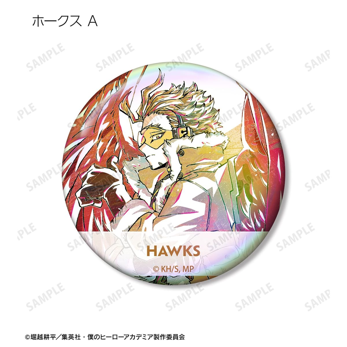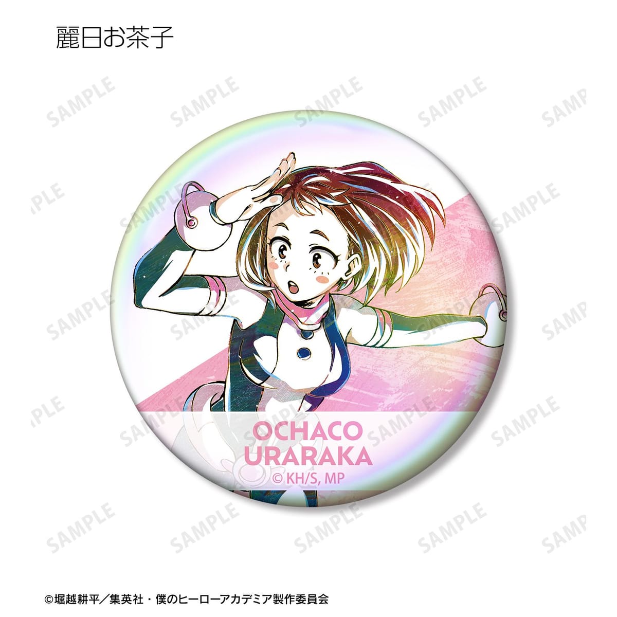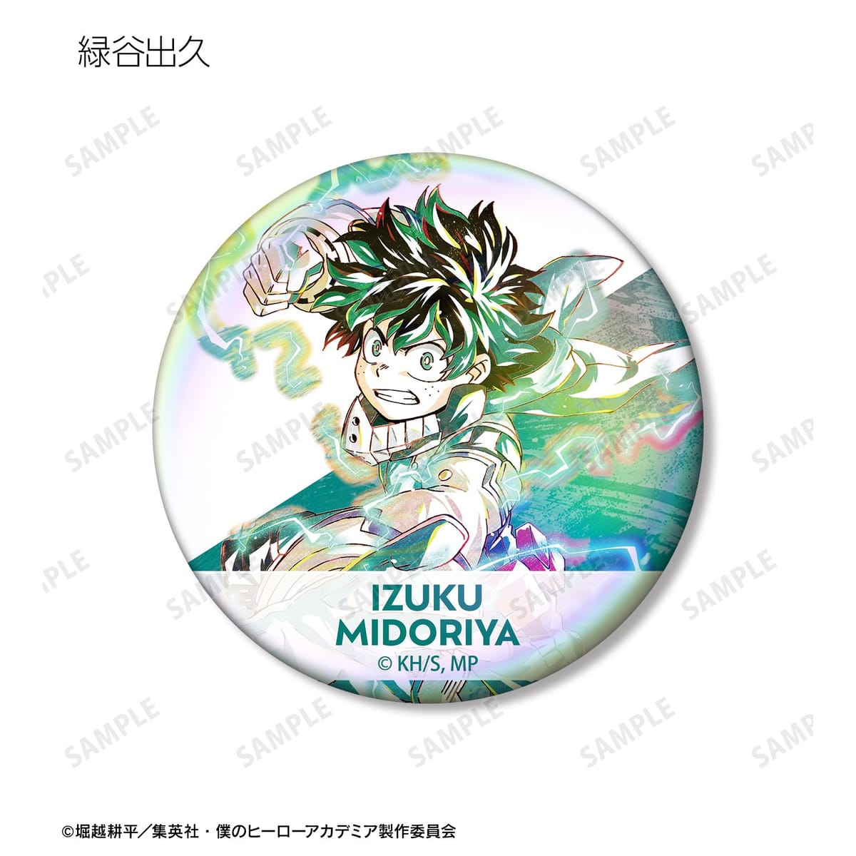 緑谷出久、麗日お茶子、蛙吹梅雨、常闇踏陰、物間寧人、拳藤一佳、オールマイト、ホークス、死柄木弔のビジュアルを新たなタッチで魅力的に表現し、オーロラ加工を施した缶バッジに仕上げました。
