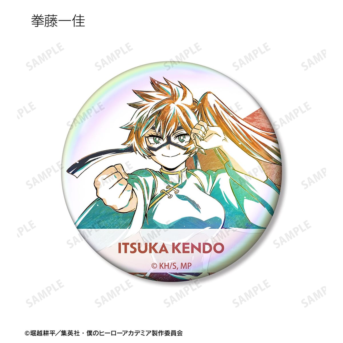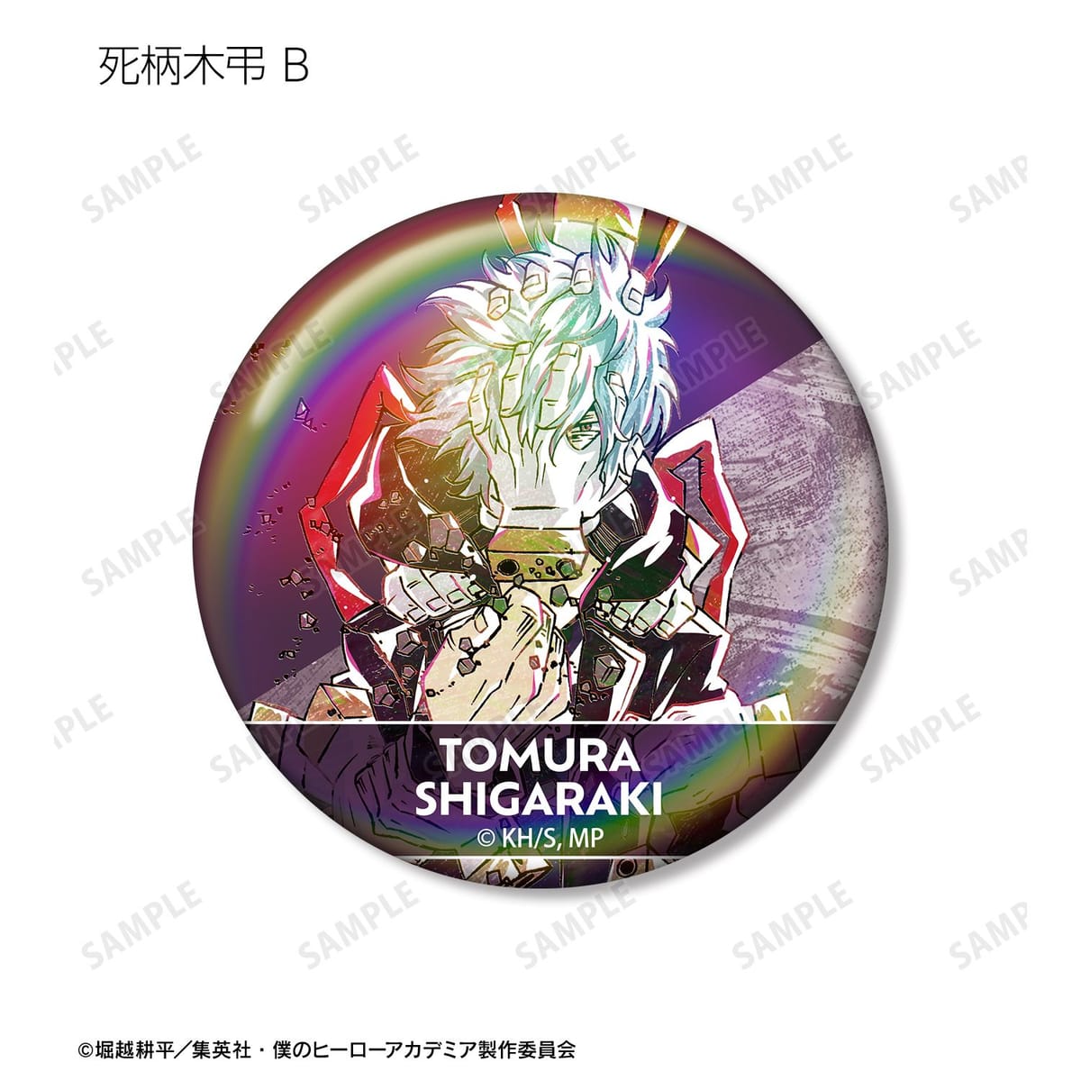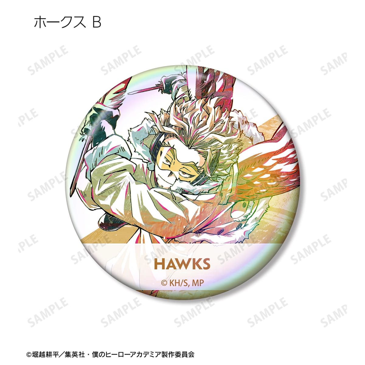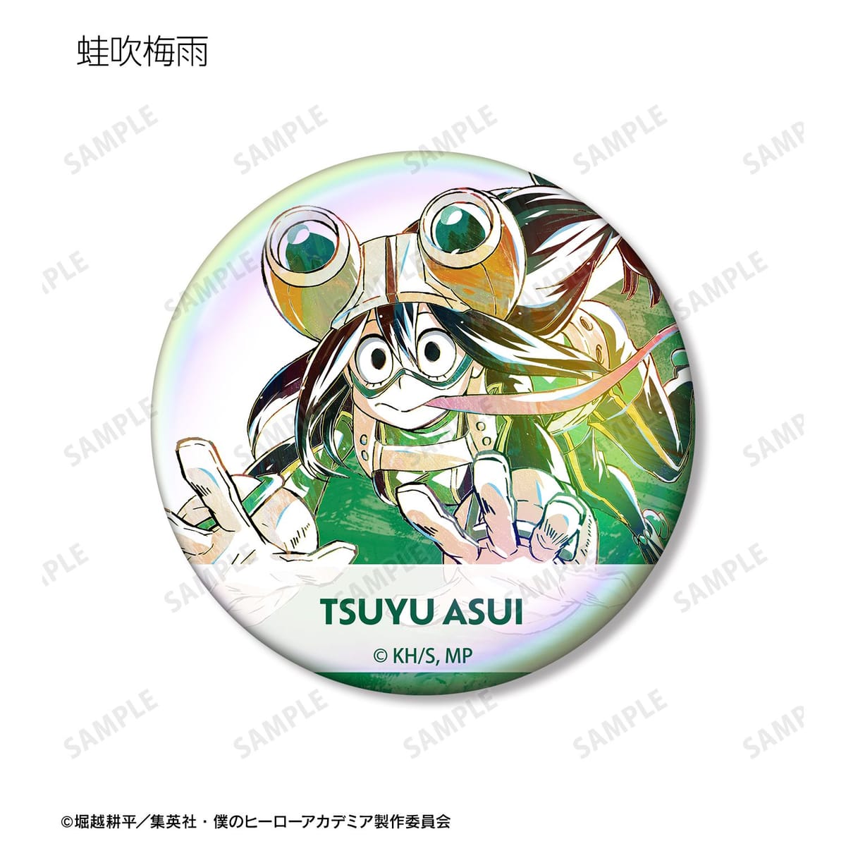 緑谷出久、麗日お茶子、蛙吹梅雨、常闇踏陰、物間寧人、拳藤一佳、オールマイト、ホークス、死柄木弔のビジュアルを新たなタッチで魅力的に表現し、オーロラ加工を施した缶バッジに仕上げました。