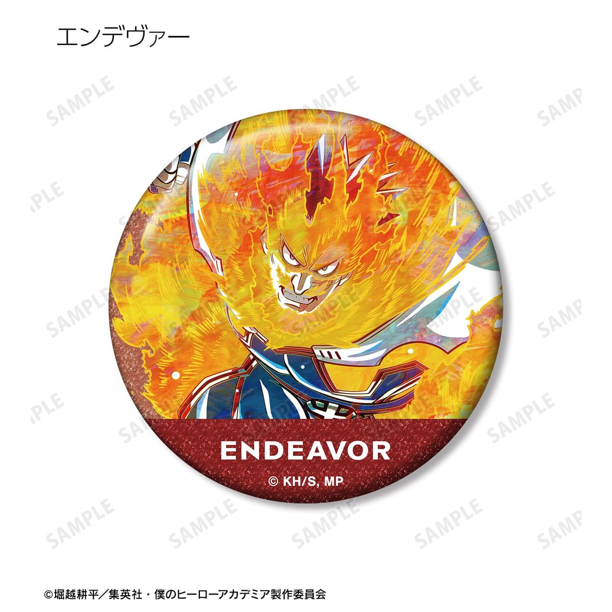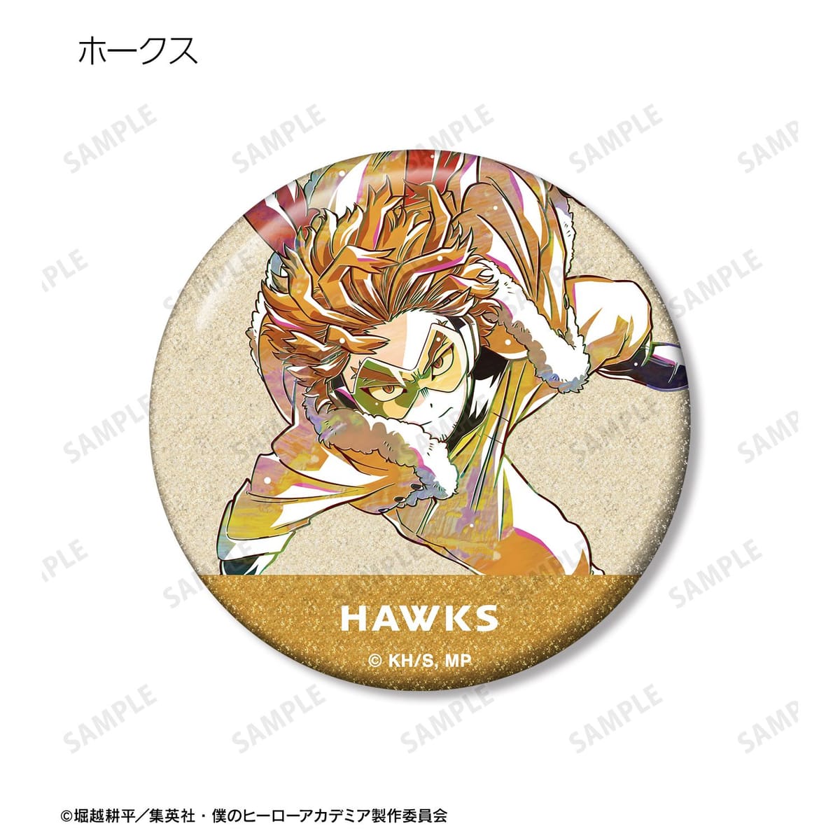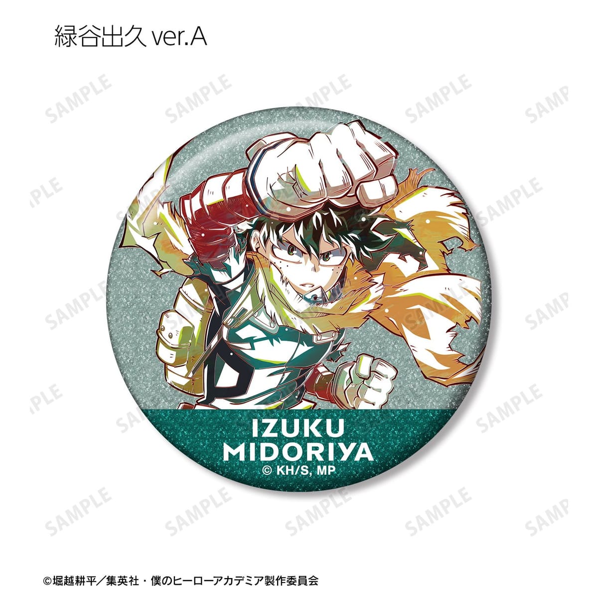 緑谷出久、麗日お茶子、轟焦凍、切島鋭児郎、オールマイト、エンデヴァー、ホークス、死柄木弔、トガヒミコのビジュアルを新たなタッチで魅力的に表現し、グリッター加工を施した缶バッジに仕上げました。