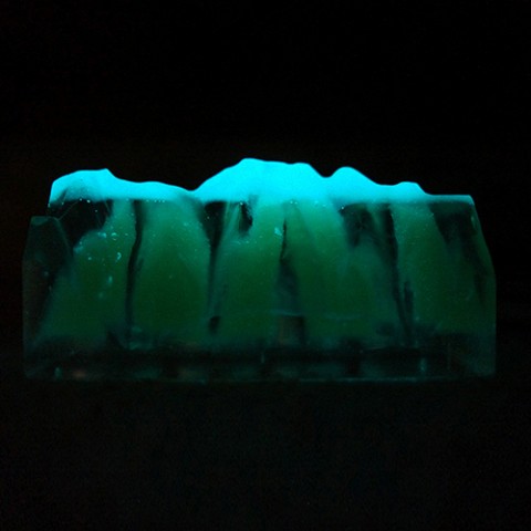 “MINE"の山並みの頂上部分にはアルプス山脈のような残雪を表現しています。日中の光を溜め込んで暗くなると青白く発光します。それはまるで夜の月光に反射して光り輝く残雪のようで幻想的です。