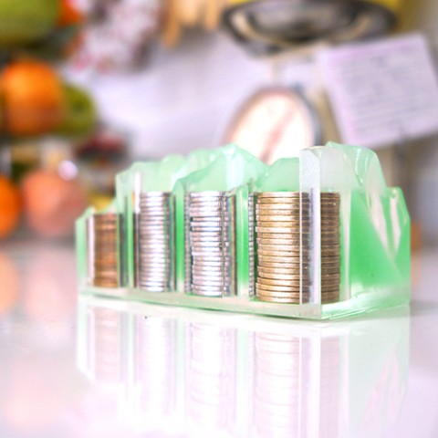 W120mm×D60mmのオフィスのデスクにも収まる小さなサイズに使用頻度の高い“500円/100円/50円/10円"の4つのコインホルダーが搭載されています。それぞれ20?30枚ほど格納できます。