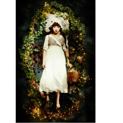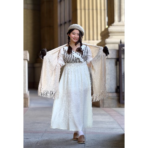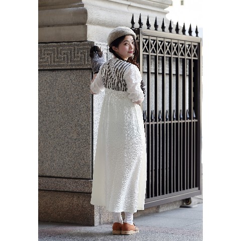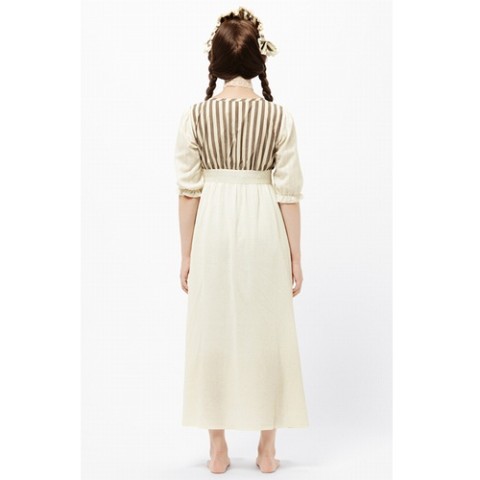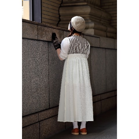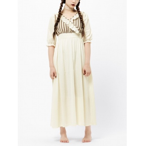 オフホワイトとグレイッシュなブラウンのストライプで、童話『赤ずきん』に登場するオオカミをイメージしたナイティドレス。カシュクールのようにフリルをあしらった広めのVネックで胸もとはすっきり。ずる賢いオオカミが、ベッドの中でおばあさんを装い、今か今かと「食べちゃう」すきをうかがっている……。そんなシーンを、安らぎあるエレガントな雰囲気で表現しました。多くの物語の中でいつも一皮まとい、本当の姿を隠して何か企むオオカミだけど、実はシャイで根はいい奴なんじゃないの? なんて空想もナイトタイムを楽しくさせるスパイスに。甘めが苦手なハンサム女子にもおすすめしたい、ちょっぴりクールなデザインです。