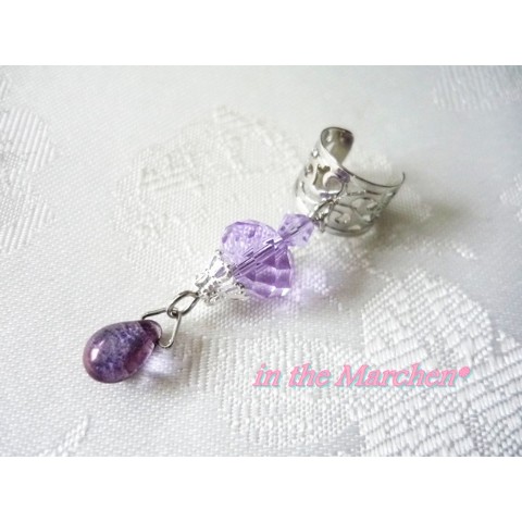 静かにきらめく白銀の透かし模様の入ったイヤーカフに、怪しく不可解な色変化を起こすカッティングされたアレキサンドライトガラスを大小一粒ずつ。