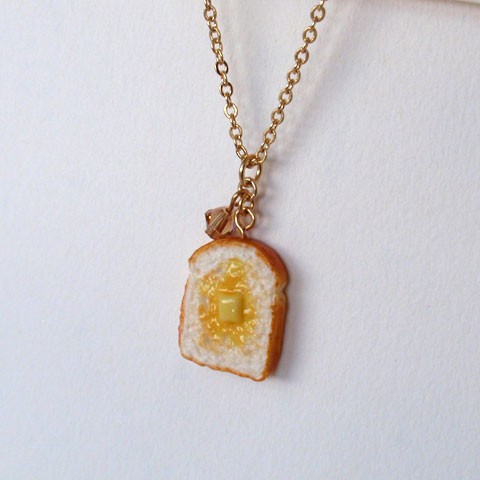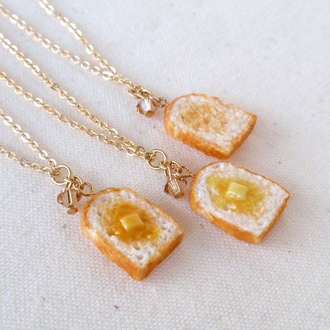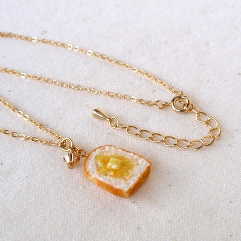 バターをのせた山形トーストのネックレス。裏側もこんがり焼けています。ワンポイントにスワロフスキービーズをつけました。