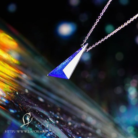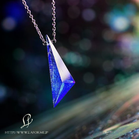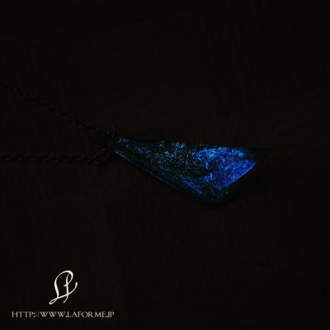 ライトスカイブルーをベースに、シャープで細身のフォルムに仕上げています。表裏同じカットは手作業で丁寧に磨きを行っております。内部には繊細なラメと蓄光加工を施しております。オリジナリティのある世界にひとつの素敵なペンダントです。