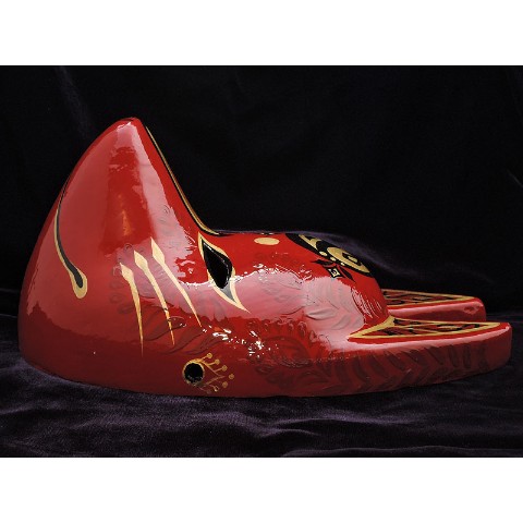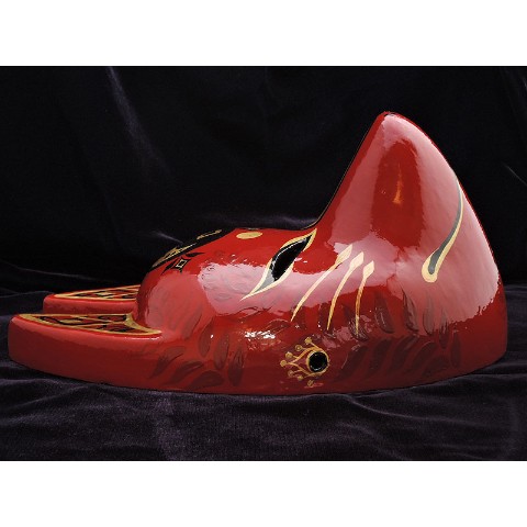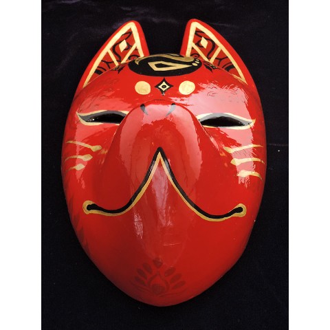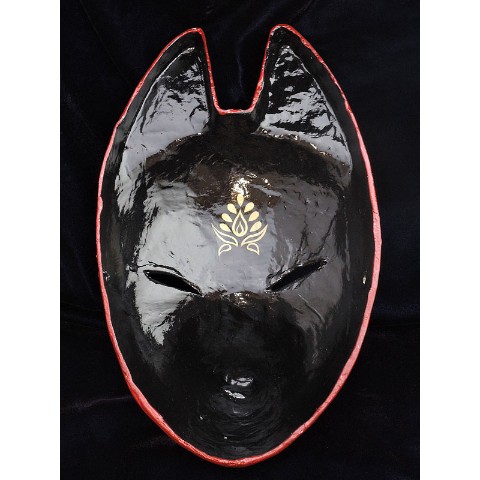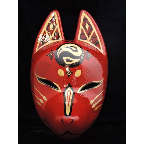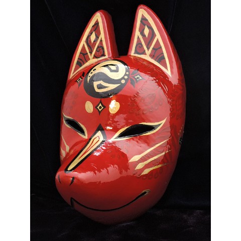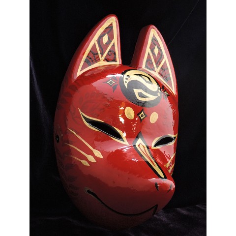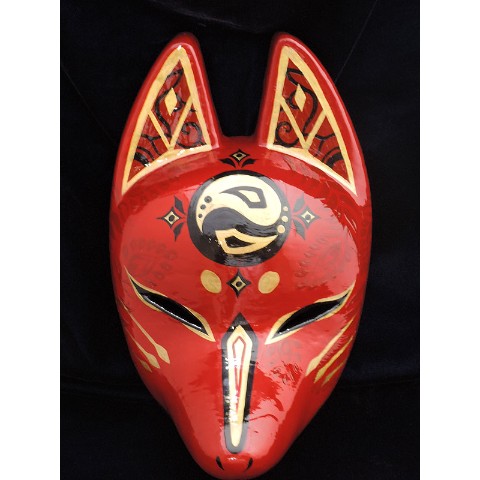 紅い地色に黒、金で彩られ、額に浮かぶのは陰陽太極図。鳳凰をイメージしてデザインされたこの狐面の特徴は、鳳凰の羽根がうっすらと浮かび上がるように描かれていること。