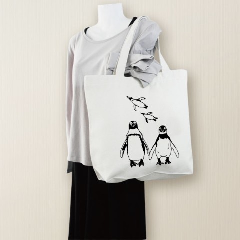 仲良く並んだペンギンが何とも可愛いトートバッグです。肩がけ出来き、A4ファイル、雑誌、角2サイズ等が余裕で入ります。大きなスマホも入る使いやすい2ポケット付き。ごわつきを抑えた、しっかりとしながらも柔らかめの厚手帆布。