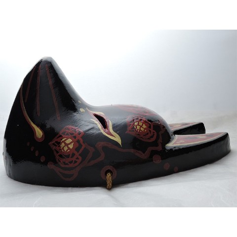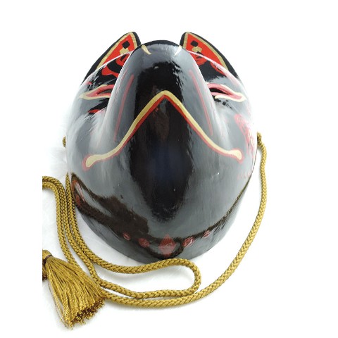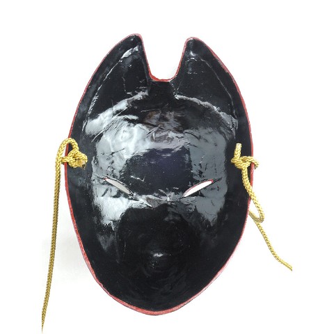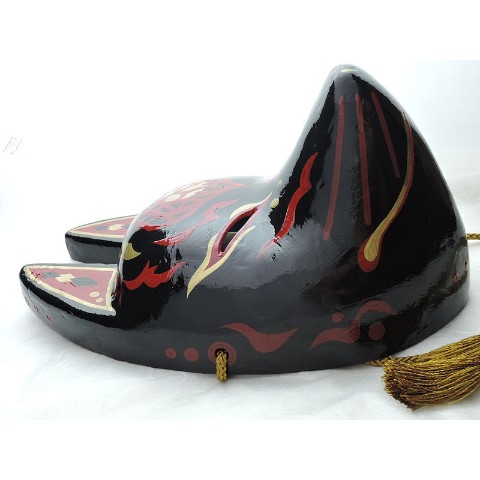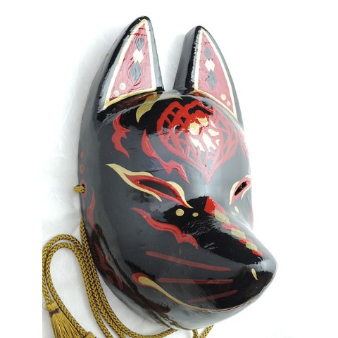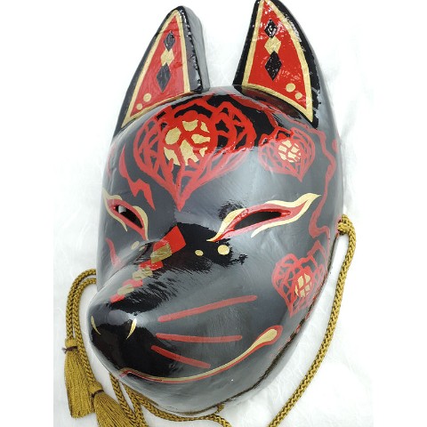この狐面の額には、赤い皮に包まれた金色の鬼灯の実……煌ーとしたその輝きは見る者を惹き込みます。赤・黒・金の三色による絵付けは妖しくも力強く、そして艶やかです。 仕上げとしてウレタン塗料で艶出しをしているため、全体に光沢を生み出しています。 また、紐留めがついているため、装着時に固定しやすくなっています。