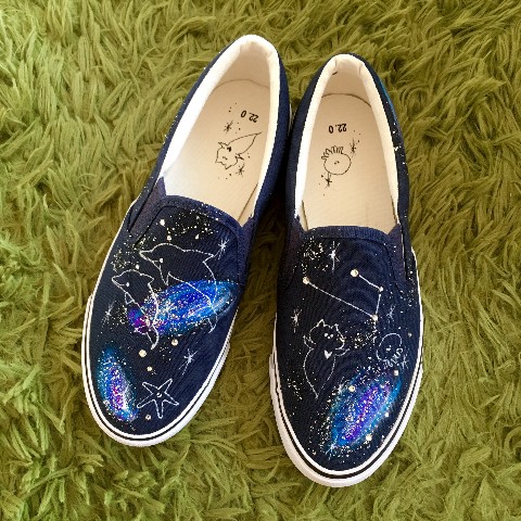 スワロフスキー級ストーンや細かいラメを散りばめ、美しい宇宙の煌めきを再現したスリッポンは、光に当たるとキラキラッとしてとても綺麗です。