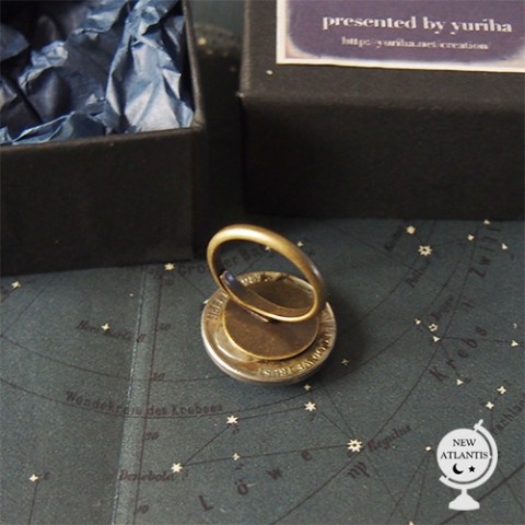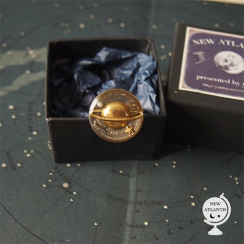 外国コインの上に土星、さらには時計部品などを配置して樹脂で封じ込めました。指元でメカニカルな世界をお楽しみいただけるアイテムです。