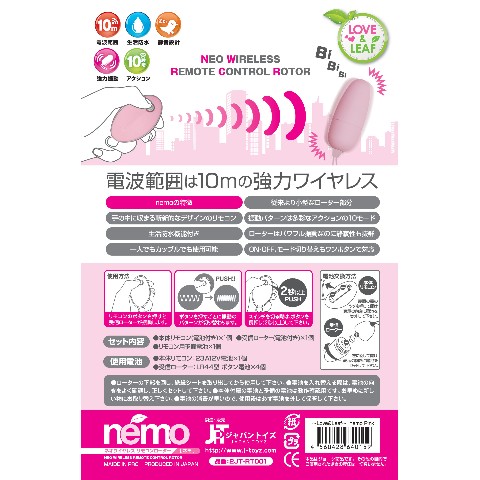 強力ワイヤレスで楽しもう!ネオワイヤレスリモコンロータ「nemo」の登場!リモコン部分は手に握りやすいリーフをイメージした斬新的な形状。従来より小型なローター部分は遊びの幅を広げます。振動パターンは多彩な10アクションを搭載。パワフル振動なのに静寂性も抜群。生活防水機能で衛生的にもGOOD。ワンボタンでオン・オフ・モード切替が可能。10m先の相手まで届くハイパワーのnemoで新しい世界を体感しよう。カラーはラブリーなピンク。ローター&リモコン部の交換用電池付き。≪ご使用上の注意事項≫1:本体付属の電池と予備の電池は動作確認用です。お早目に新しい物にお取替え下さい。2:振動させていなくてもローターは電波受信の為に電池を消費しています。使用後は必ず電源をOFFにして保管して下さい。3:リモコン用電池の放電防止フィルムを取り外してからご使用ください。