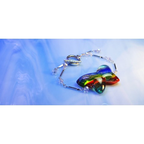 美しい虹色をまとった蝶が舞う、印象的なイメージのオリジナルブレスレットです。丸みのある蝶のフォルムに色のグラデーション。チェーンにはレインボーに輝くカットビーズを施しました。