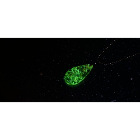 淡い薄紅色をベースに金箔をふんだんに散りばめた美しいドロップタイプペンダントです。さらに内部には光を吸収する度にホタルの光のように神秘的なグリーンの光を放つ蓄光加工を強めに施しています。優しいイメージのネックレスです。