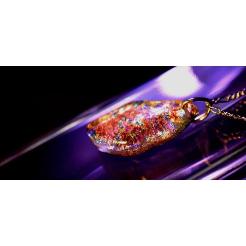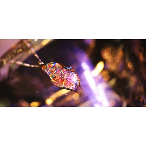 まさに天国や宇宙のような神秘的でミステリアスな雰囲気の不定形フォルムのネックレスです。内部にはブラックをベースにしたダイクロ偏光ガラスを使用しておりますので、強い存在感の煌きをお楽しみいただけます。