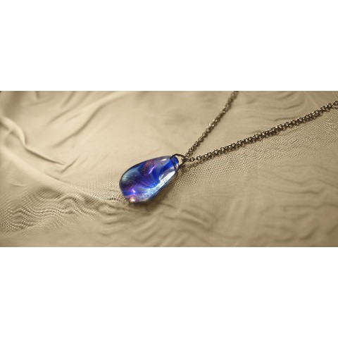 クリアーにピンク系、ブルー系ホワイト系を使用してマーブルデザインにいたしました。光を吸収する度にホタルのような神秘的な光を放つターコイズブルーの蓄光加工を施しました。身に着け易い、可愛らしいドロップタイプのネックレスです。