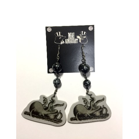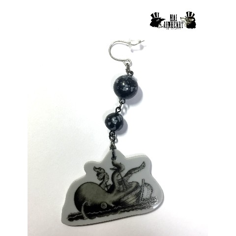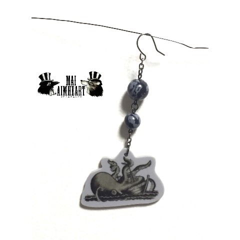 天然石をアクセントに使用した海の怪物クラーケンのイラストのイヤリング