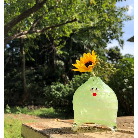 ちょっととぼけた顔のガラスの花瓶。彼らの頭に花を咲かせてあげてください。