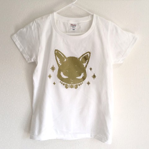 ガーリー★キラキラリボン猫のTシャツです。白地に金プリント。