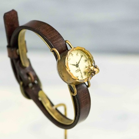 【カエルの時計屋さん】池をのぞく蛙腕時計(Sベージュ江戸文字)