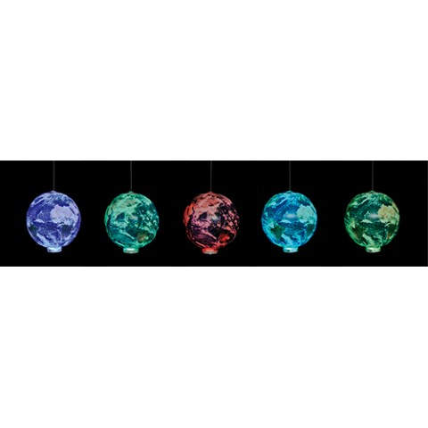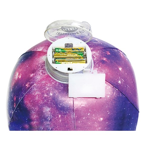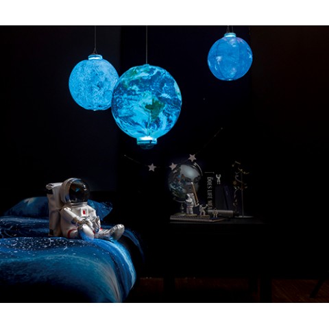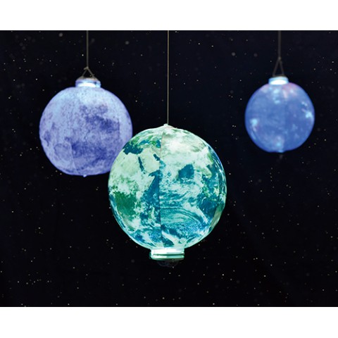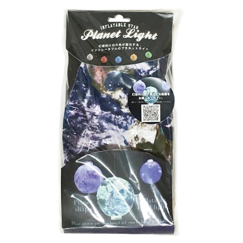 幻想的な光を放つ、プラネットライト。内蔵されたLEDライトの色が七色に変化していく。電気を消して楽しめば、宇宙に浮かぶ惑星のよう。インフレータブルになっているので、吊り下げて楽しむこともできます。