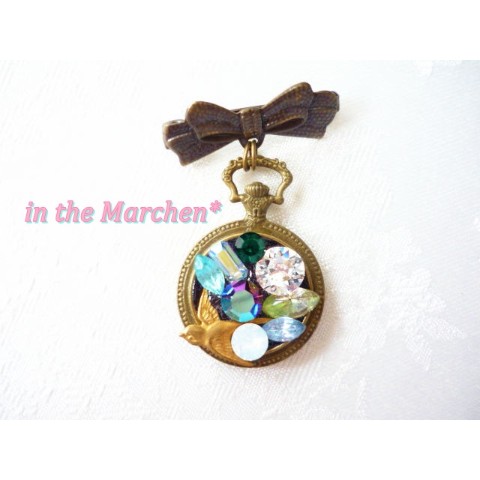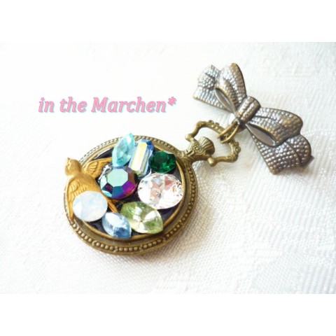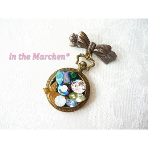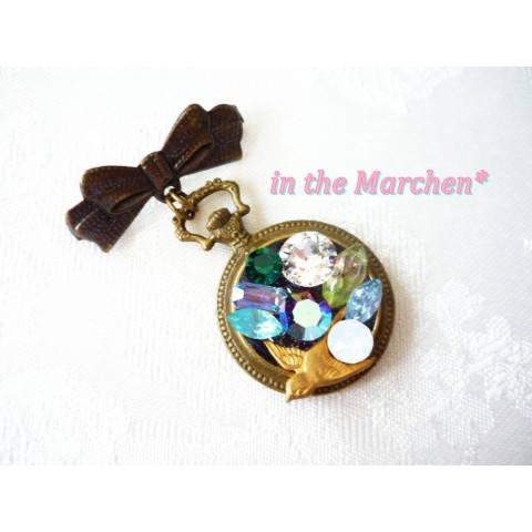 【in the Marchen*】「旅立ち」アンティーク風懐中時計型リボンブローチ 宝石の寄せ盛り細工