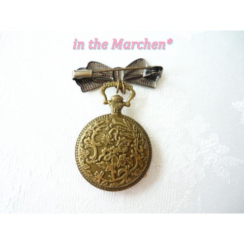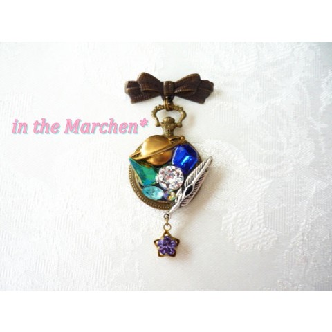 【in the Marchen*】「惑星探索」アンティーク風懐中時計型リボンブローチ 宝石の寄せ盛り細工