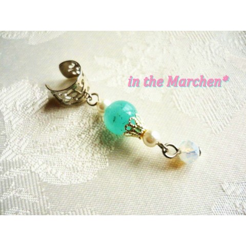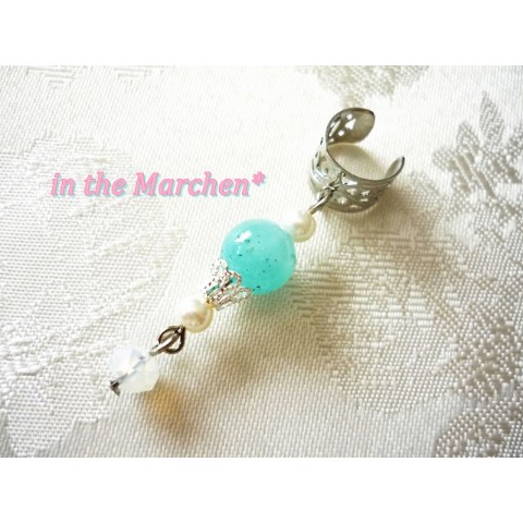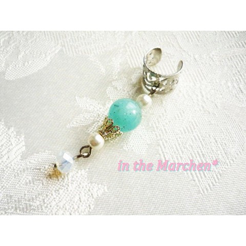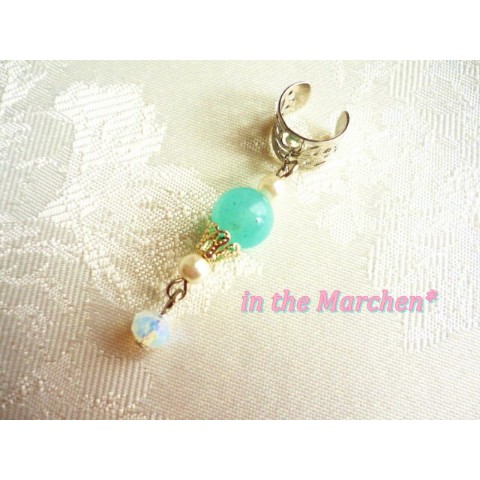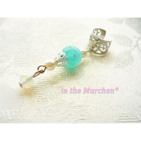 静かにきらめく白銀の透かし模様の入ったイヤーカフに、柔らかい色合いのアマゾナイトと小粒のパールに、乳白色のカットガラスを添えて。