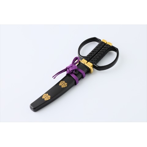 伊達政宗の愛刀をモチーフにしたハサミです。刃体の反りや刃紋、鞘の家紋など細部までこだわっております。刃物の町関市の職人が1本1本丁寧に刃付けをしているため、切れ味も抜群です。竹に雀家紋と紫色の下げ緒が政宗を彷彿とさせます。