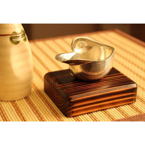古くから知られる錫の高級酒器にあわせて土台は焼杉、箱は桐を採用しました。焼杉の土台へは窪みが付いている為、ヘルメット形状のぐい呑みも安定して置くことができます。