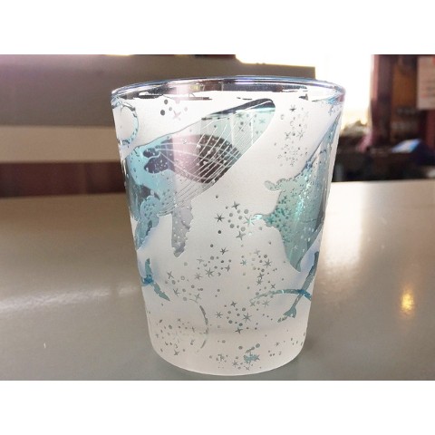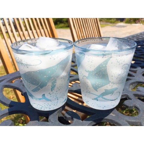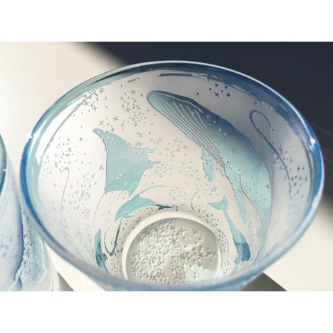 ザトウクジラ、ウミガメ、マンタ、イルカが海の中を優雅に仲良く泳いでいる様をイメージしております。泳ぐ際の水のきらめきも底面はもとより全体に表現しており、飲み物を注いでいただくとよりリアルな海中が現れます。