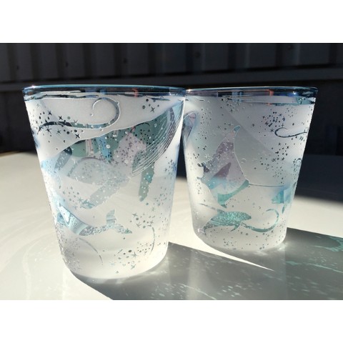 淡い青色シャボングラスに海の生き物たちを描き、サンドブラスト技法にて彫刻しております。