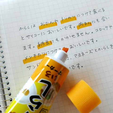 ご家庭の食卓でおなじみのチューブ入り香辛料をモチーフにした蛍光ラインマーカーです。和からしはコクのあるライトオレンジ。本物同様の紙箱入りです。