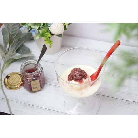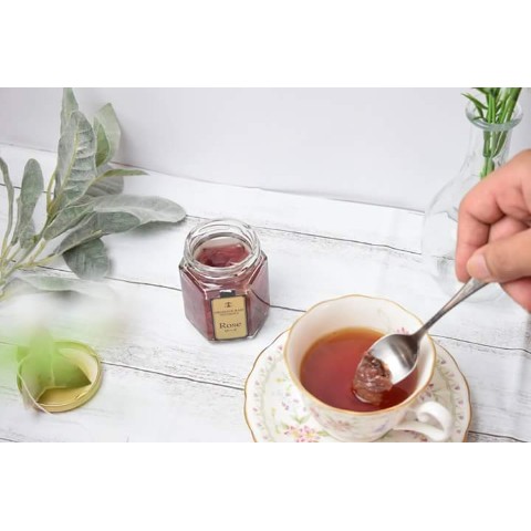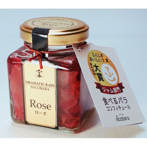 福島県須賀川市で化学農薬を用いずに栽培した、香りも、色も、口当たりも良い"ドラマチックレイン"という薔薇の花弁を砂糖、レモン果汁、オレンジペクチン で煮込んで瓶詰しました。糖度が普通のジャムよりも低いので サラサラしており、ヨーグルトにかけたり、バニラアイスにかけたり、炭酸で割って飲んだりすると、バラの花びらを噛んだ時にバラの香りが口いっぱいに広がります。