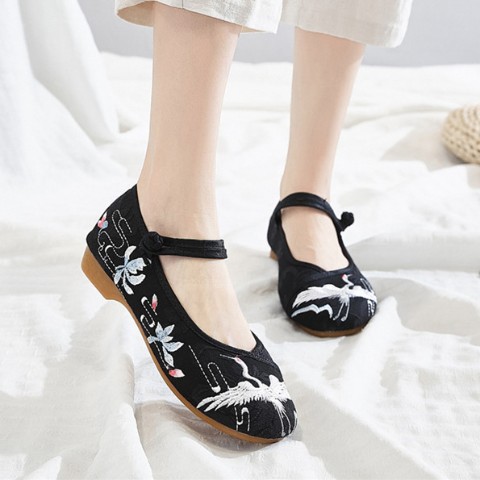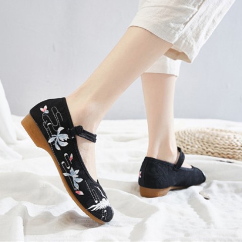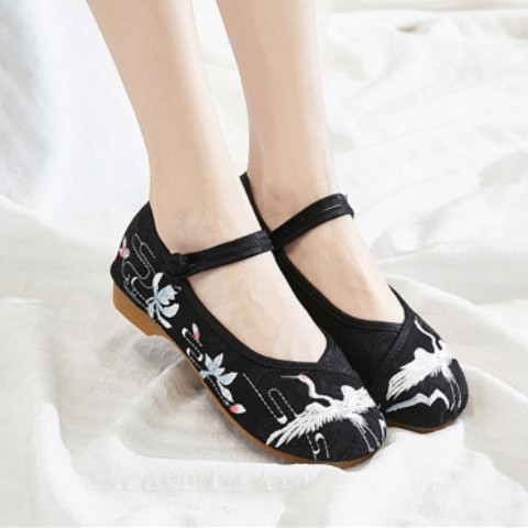 飴色シュガーカラーの刺繍が入った鶴中華シューズ