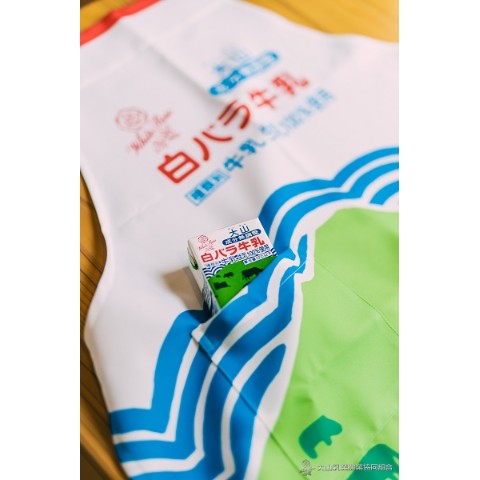 看板商品「白バラ牛乳」のパッケージタイプのエプロンです。
