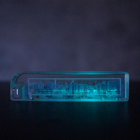 フィルムとフィルムの間の下部に光を溜めて暗闇で発光する蓄光塗料を付着しました。暗闇でぼんやりと発光する光は、遠い昔に忘れていた場面を思い出してくれているようです。暗い場所で光るSCENEは幻想的に輝きます。