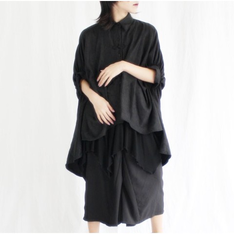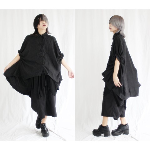 FUNKY FRUIT/バルーンスリーブイレギュラーヘムチャイナボタンシャツ(ブラック×ブラック)