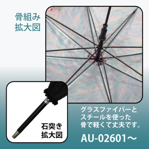 サイズ:φ103×L87cm(広げた時のサイズ)、親骨の長さ…58cm(8本) 重さ:約390g 材質:かさ生地の組成…ポリエステルポンジー100%(二重張り)、ハンドル…ウッド、リブ…グラスファイバー・スチール、シャフト…スチール 仕様:晴雨兼用、UVカット率99%