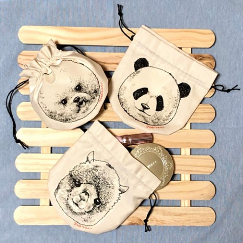 白黒が可愛い動物のお顔線画をプリントしたミニ巾着袋です。