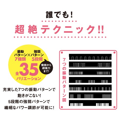 振動パタ-ン7種類!強弱パタ-ン5段階!全35バリエ-ションの多機能!使い勝手のいいちょうどいいサイズ。ちょうどいい軽さ。で実用性を向上させました。