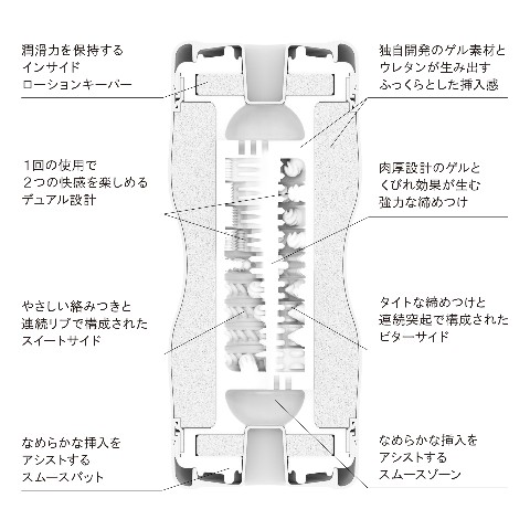 ぎゅっと締めつける『ビタ-サイド』と、やさしく絡みつく『スイ-トサイド』という、異なるふたつの快感を楽しめる贅沢なカップです。