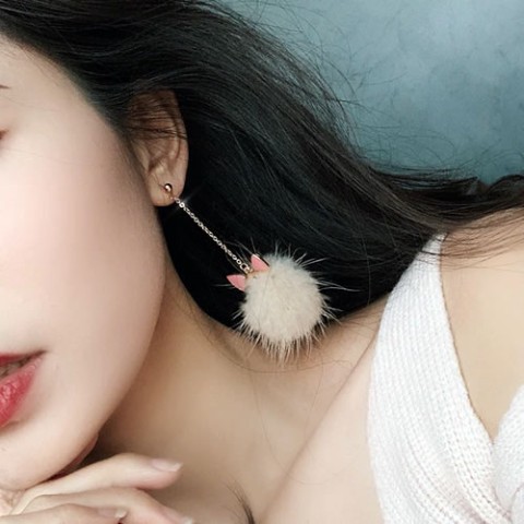 ふわふわのベージュのファーから、ピンクのネコミミがちらっと覗く大人可愛いピアスです♪