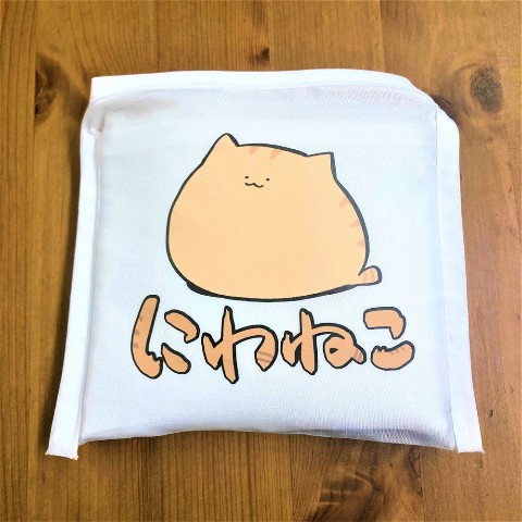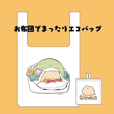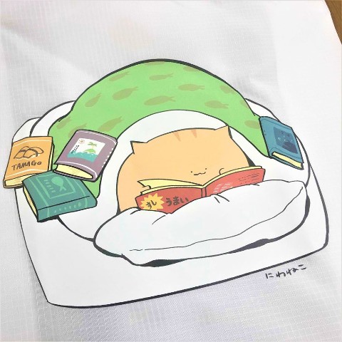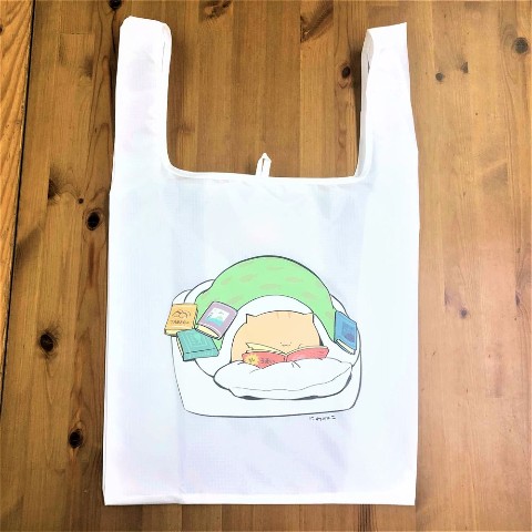 お布団ゴロゴロしながら読書をするにわねこのエコバッグ。読んでいる本にも注目!