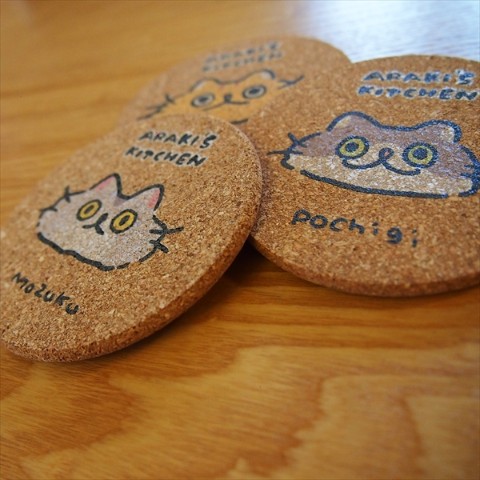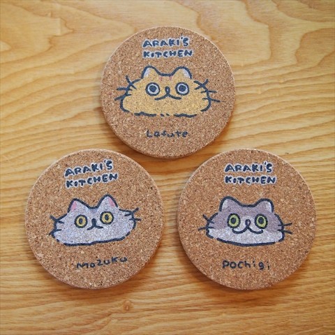 あらきさんの愛猫3匹がモチーフのコルクコースターです。