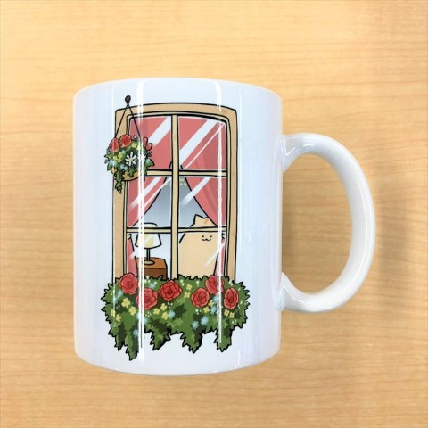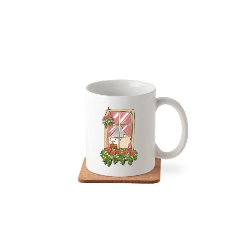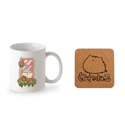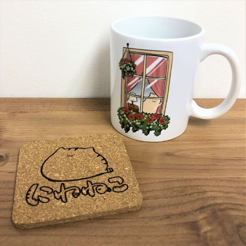 小窓からチラリと見えるにわねこがデザインされたマグカップ&ロゴデザインのコースターでティータイムをお楽しみください♪