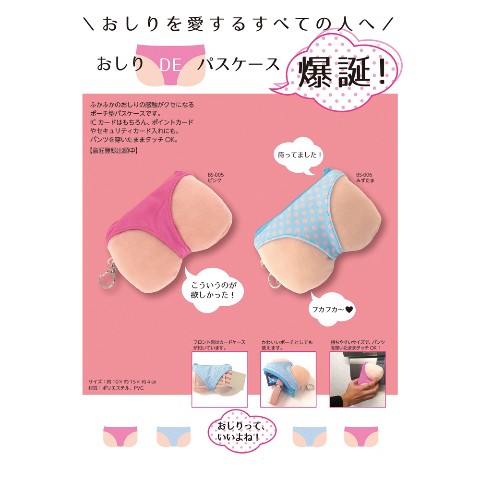 ポーチ、パスケース、ふかふかのおしり。3つの機能が1つになった、画期的アイテム。お尻側は左右に綿が入って、まるいお尻を再現。フロント側にはICカードが入れられます。ショーツ生地は薄いので、そのままタッチ&ゴー!お好みで、チェーンや伸縮リードを取り付けられます。上部のファスナーを開ければ小物が入れられます。手のひらにおさまるちょうどよいサイズ。バッグに付けてもキーホルダーにしても、存在感バツグンです。●小さな部品があります。口の中には絶対入れないでください。●機能上、製品の一部に尖った部品があります。製品の使用の際は注意してください。●変形、変質や火災の原因となりますので、高温多湿な場所に放置したり、火気に近づけたりしないでください。●変形、変質の原因となりますので、洗濯はしないで下さい。