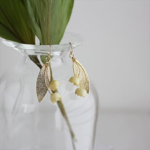 わたしの大好きな花、本物のすずらんの花でつくった、アイボリー色の優しい雰囲気と、ペールゴールドの装飾がとっても素敵なピアスです。