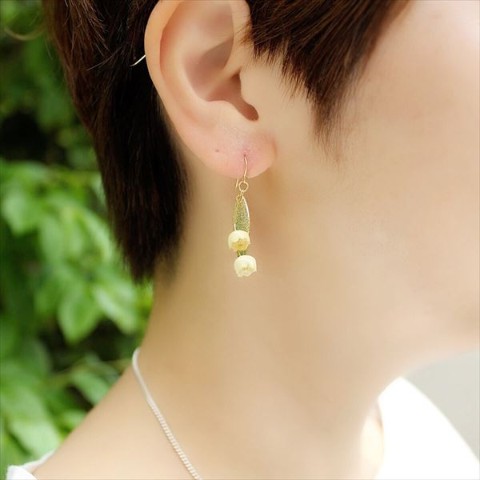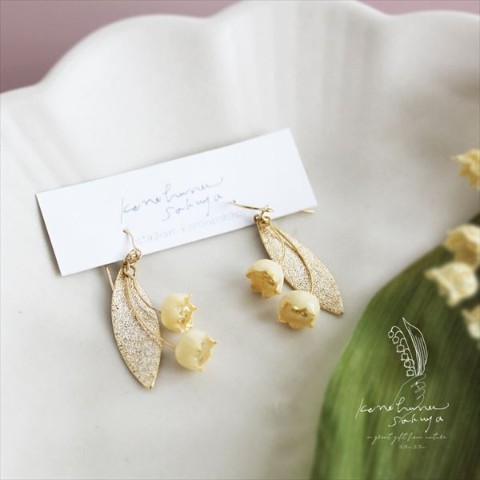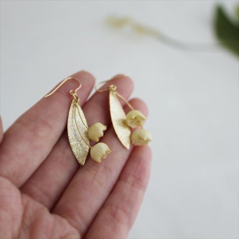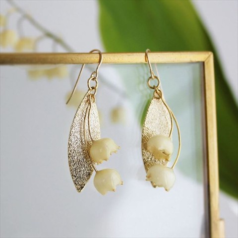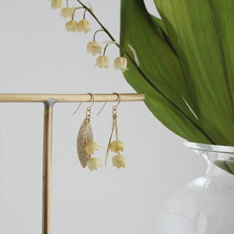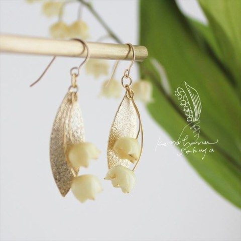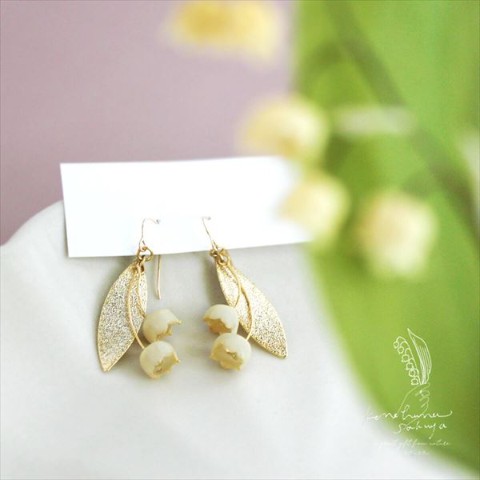 わたしの大好きな花、本物のすずらんの花でつくった、アイボリー色の優しい雰囲気と、ペールゴールドの装飾がとっても素敵なイヤリングです。