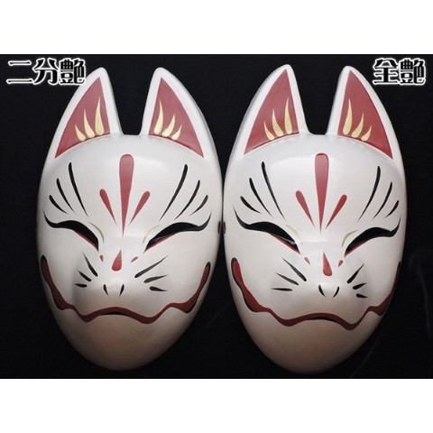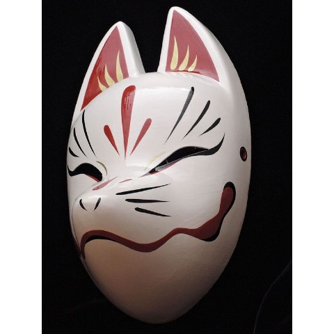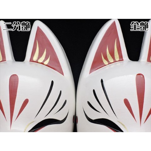 色遣いはシンプルに、しかしながら魅惑的に。地の白をベースに赤・黒・金の三色で絵付けをされたこの鈴稲は、狐面の王道の良さを追求しました。貴方の新たな顔として、角度によってさまざまな表情を伝えてくれることでしょう。
