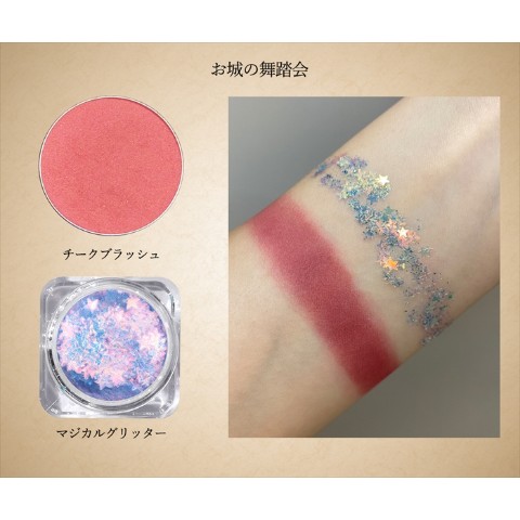 シンデレラの一場面を切り取ったイラストを使ってシンデレラの世界観を演出しるチークとマジカルグリッターのコスメパレットです。チークは粉質がやわらかく、少量でも高発色でな健康的な血色感を演出します。グリッターはザクザクした大粒のラメや立体感のあるホログラムが特徴的でワンポイントで輝きを演出します。